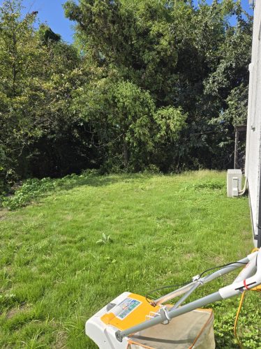 事務所庭の 芝刈りや雑草引きをやっと行いました