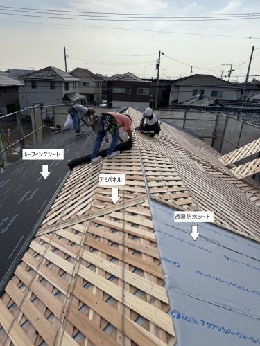 さらにその上から透湿性を持つルーフィングシートを施工することで、